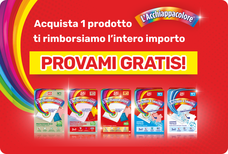 Acquista 1 prodotto a marchio L’Acchiappacolore per ricevere il rimborso del 100% del prodotto acquistato.