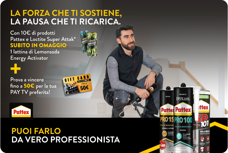 Acquista dal 1/07/2025 al 30/09/2025 almeno 10€ di prodotti della linea Pattex Pro, sigillanti PATTEX SP101 e Loctite Super Attak per partecipare all’estrazione finale di un Buono del valore massimo di 50€ per l’acquisto di ricariche o abbonamenti a piattaforme Pay Tv e streaming.