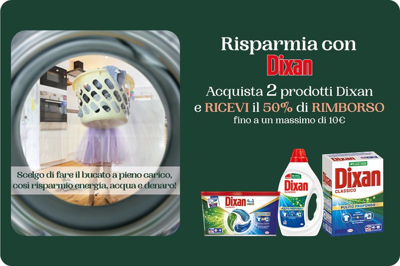 Acquista dal 01/09/2025 al 01/11/2025 2 prodotti a marchio Dixan per ricevere il rimborso del 50% dei prodotti acquistati per un massimo di 10€.