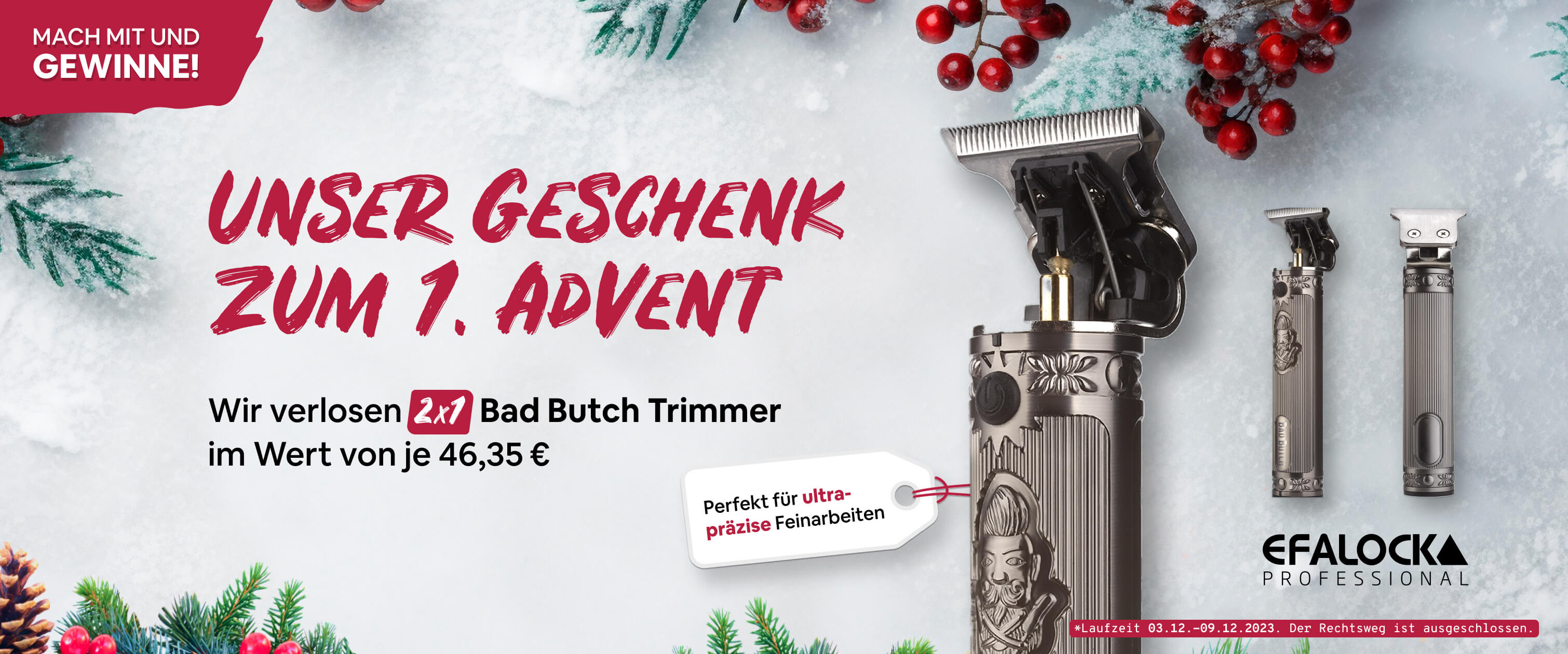 Se vuoi partecipare al concorso inserisci i tuoi dati nel form sottostante. Le nostre condizioni di partecipazione al concorso sono le seguenti: Tutti i partecipanti possono prendere parte al concorso fino al 9 dicembre 2023. I vincitori dell'estrazione verranno avvisati via e-mail l'11 dicembre 2023. https://www.stopperka.de/gewinnspiel-bad-butch-trimmer https://www.stopperka.de/media/g0/1f...andingpage.jpg